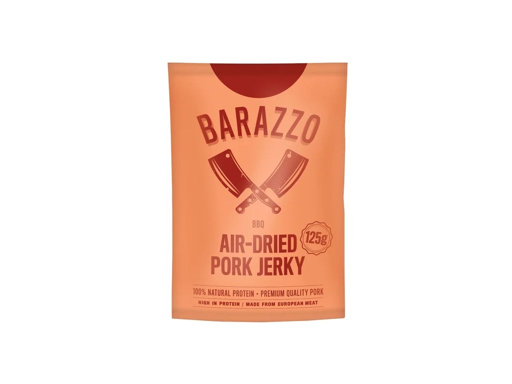 Barazzo Vepřové Jerky BBQ 125 g je prémiová svačina, která spojuje křehké sušené vepřové maso s bohatou, kouřovou BBQ chutí. Každý plátek je vyroben z pečlivě vybraného vepřového masa, které prochází tradičním sušením na vzduchu, aby si zachovalo svou šťavnatost, jemnou strukturu a plnou chuť. Díky tomu nabízí intenzivní gurmánský zážitek, který zaujme všechny milovníky kvalitního jerky.