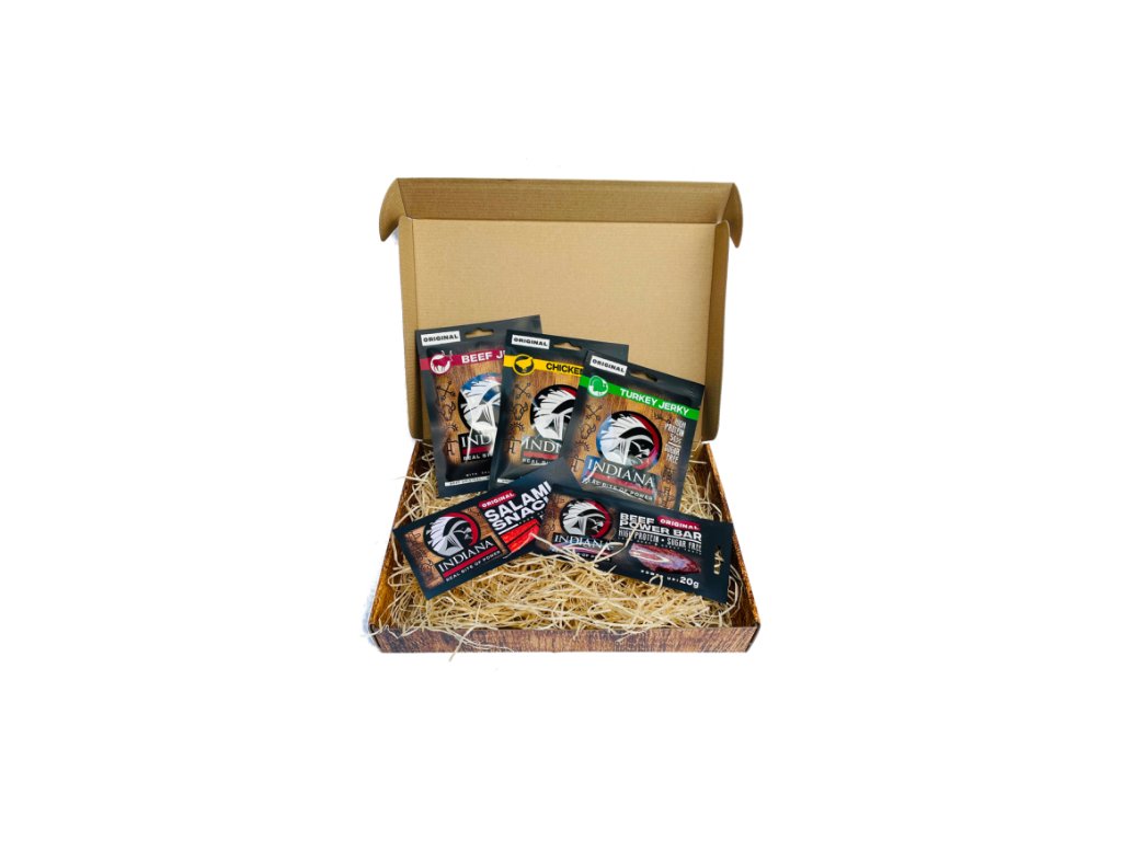 Sušené maso INDIANA Jerky v dárkovém setu je kombinace chutných masový snacků, které uvítáte převážně na cestách nebo při sportování. Každé balení pochoutky Jerky je plné hodnotných bílkovin, dokáže tak rychle doplnit energii například při horských pochodech nebo cyklovýletech. Výrobce Jerky vybírá pro své zákazníky jen to nejkvalitnější maso, navíc jsou produkty Jerky bez lepku i bez přidaných glutamátů a jako dochucovadlo je v nich obsažena pouze sůl z Mrtvého moře. Součástí dárkového setu jsou přitom masové snacky Jerky turkey Original, Jerky chicken Original a Jerky beef Original. Nechybí ani Salami Snack, který představuje ideální svačinu, a steakový plátek sušeného masa Steak Bar Original.