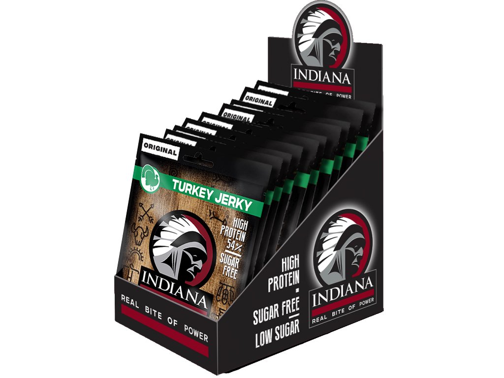 Pro sportovce nebo zdatného výletníka není zdravější, rychlejší a výživnější svačinky než sáček Indiana Jerky z krůtího sušeného masa. Je to lehká, na dotek nemastná pochoutka, která obsahuje 54 % proteinů a jen minimum tuku. Jedná se o náčelníkovu originální recepturu s nezaměnitelnou evropskou slanou chutí masa.