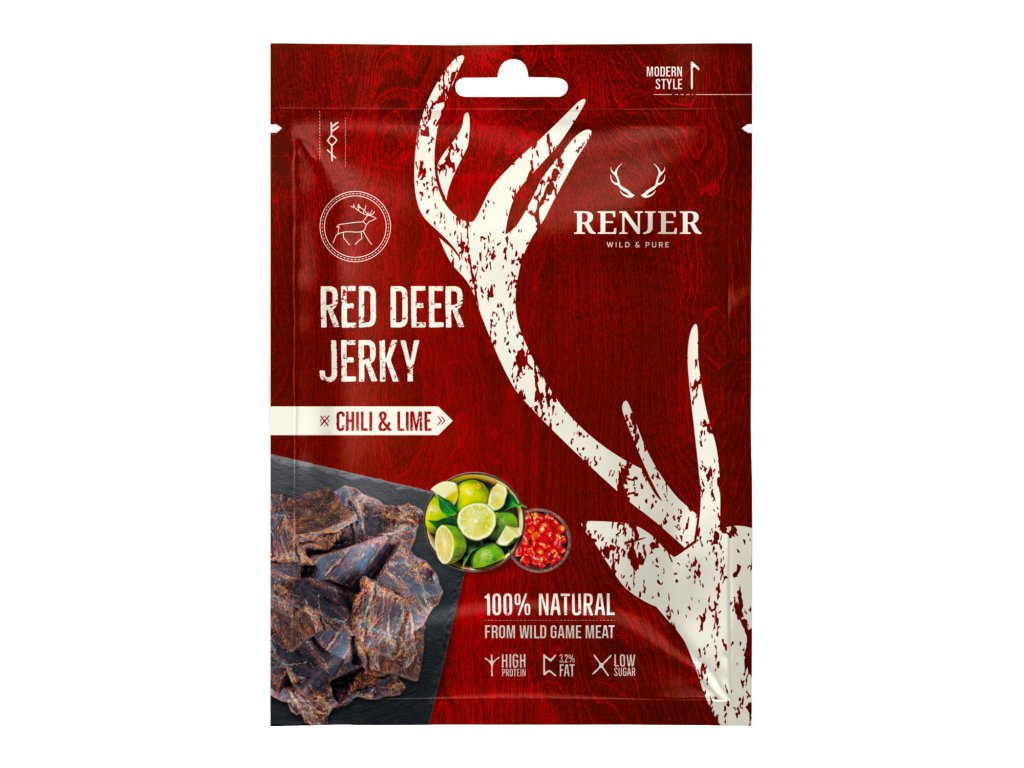 Užijte si autentickou chuť divočiny z hlubokých lesů severní Evropy! Jelení sušené maso Renjer Red Deer Jerky Chili & Lime je ručně řezané a delikátně sušené tak, aby si zachovalo svou přirozenou chuť. Jedná se o prvotřídní maso z divoké lesní zvěře s přirozenou stravou, které má vysoký podíl bílkovin.
