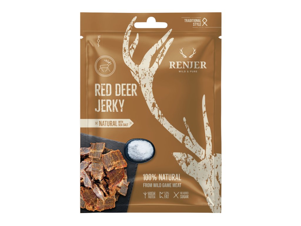 RENJER - to je pravá chuť divočiny z hlubokých lesů severní Evropy! Ochutnejte fantastické jelení, losí a sobí sušené maso od Renjer. Každý kousek je ručně řezaný a delikátně sušený, aby si zachoval svou jedinečnou chuť. Jde o sušené maso z divoké lesní zvěře, které má přírodní stravu. Důsledkem toho je maso opravdu bohaté na živiny. Vyznačuje se vysokým obsahem bílkovin s malým množstvím tuku a nulovým podílem sacharidů. Důkladný výběr syrového masa a šetrná výroba je zárukou nejvyšší kvality.